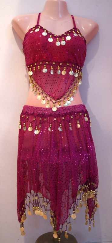 Overview3-piece Harem costume top and skirt size S, XS, XXS. Fabric with shiny dots. Decoration with golden beads and coins. Great layered over your favourite harem pants.