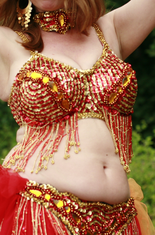 Overview5-piece professional Bellydance Show costume, beads, sequins and beaded fringe decorated "Flame".