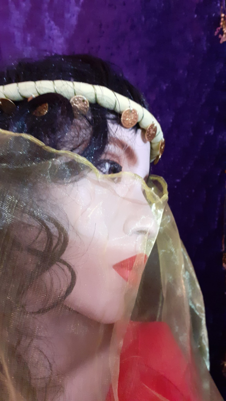 Overview1001 Night harem party veil GREENISH YELLOW with LIGHT GREEN headband, decorated with GOLDEN coins. Closure: ties at the back of the head, adapting the size. Party wear for an oriental princess or a bellydancer.